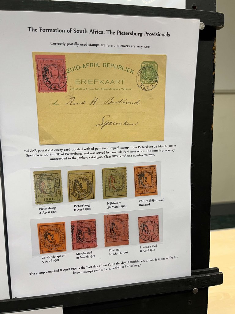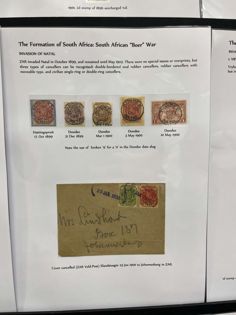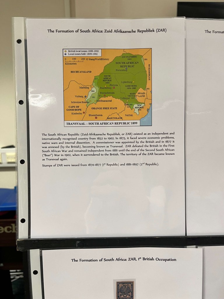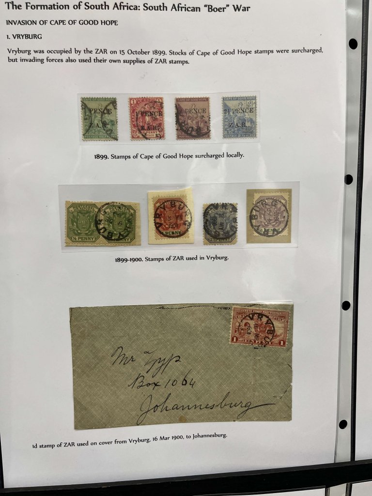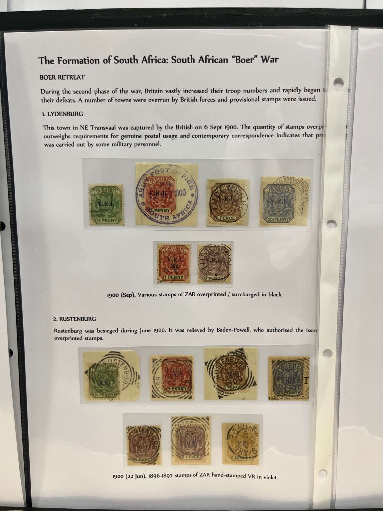 In part two we were treated to a short history of pre Union South Africa, with stamps and mail from all over the continent, including Cape of Good Hope, Orange Free State, Natal, Zululand, Swaziland and the New Republic. Many of the stamp sets were quite challenging to put together and large parts of the postal history were also uncommon.